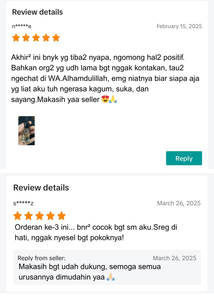 InsyaAllah minyak ini efektif atas izin Allah. Namun, efektivitasnya bisa berbeda-beda tergantung individu. Minyak ini hanyalah ikhtiar untuk membantu urusan harian kita — bagaimanapun, hanya Allah yang memberi izin dan hasilnya. Efeknya juga tergantung pada masalah yang sedang dihadapi. Ada juga yang merasakan manfaatnya seawal 1 minggu penggunaan.